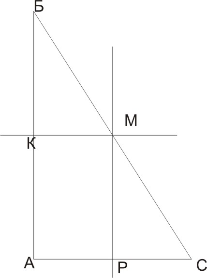 КМ и МР являются средними линями тр-ка АБС относительно катетов АС и АБ соответственно, так как паралельны им и т. М - середина гипотенузы БС