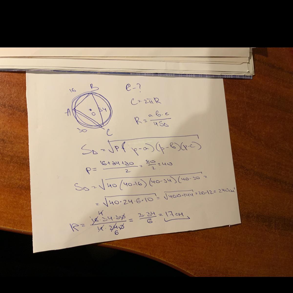 Допоможіть дуже сросно треба Знайдіть довжину кола, описаного навколо трикутника зі сторонами 16 ми, 30 см, 34 см.