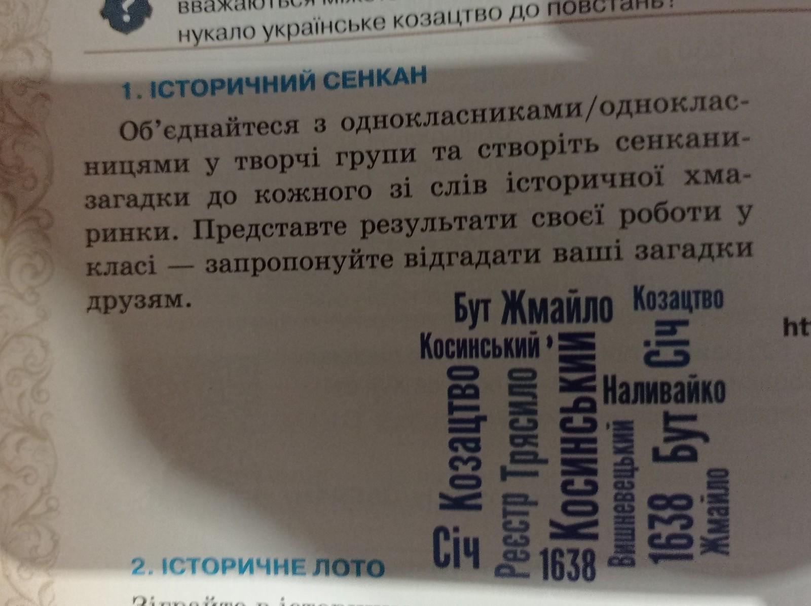 1. ІСТОРИЧНИЙ СЕНКАН Об'єднайтеся з однокласниками/одноклас- ницями у творчі групи та створіть сенкани- загадки до кожного зі слів історичної хма- ринки. Представте результати своєї роботи у класі запропонуйте відгадати ваші загадки друзям. Бут Майло Козацтво