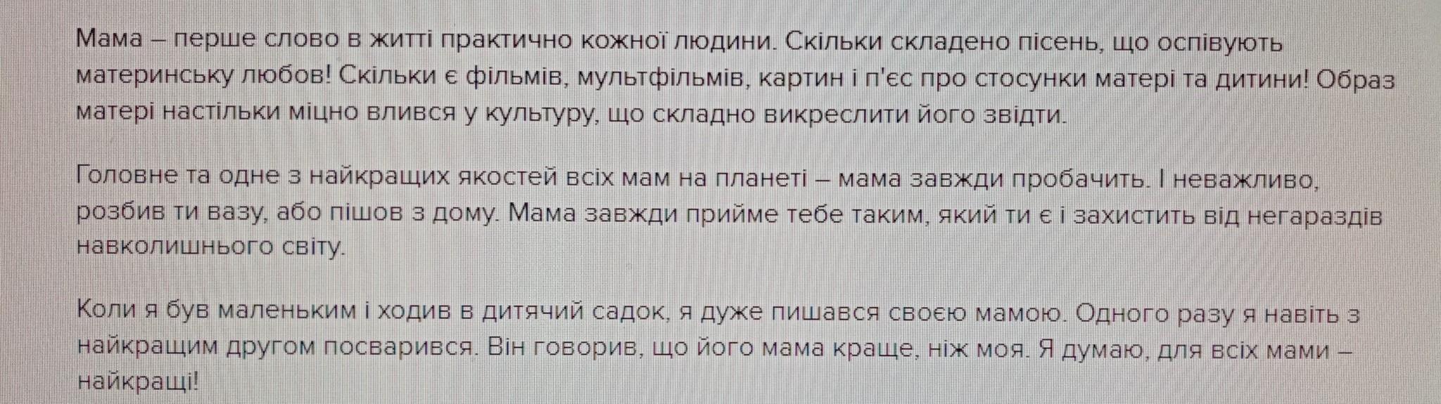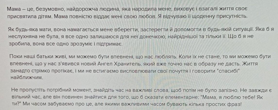 Кожному з нас подарувала життя - мама.Вона нас народила та виростила, коли ми хворіли вона тихо плакала над нами.Мама,завжди приласкає та допоможе,вона хоче нам найкращого.Мамина усмішка заставляє мене всміхнутися.Її любов зігріває душу,коли вже здається що ніщо не допоможе.Я можу розказати свої проблеми і вона заохоче допоможе.Я дуже вдячна мамі за все що вона зробила.Люди не цінують своїх батьків , коли ті не покидають нас, тільки тоді ми хочемо повернути все назад.Вони не хочуть щоб ми покидали родинне "гніздо",так як хвилюються за нас.Мама спасибі тобі за все !
