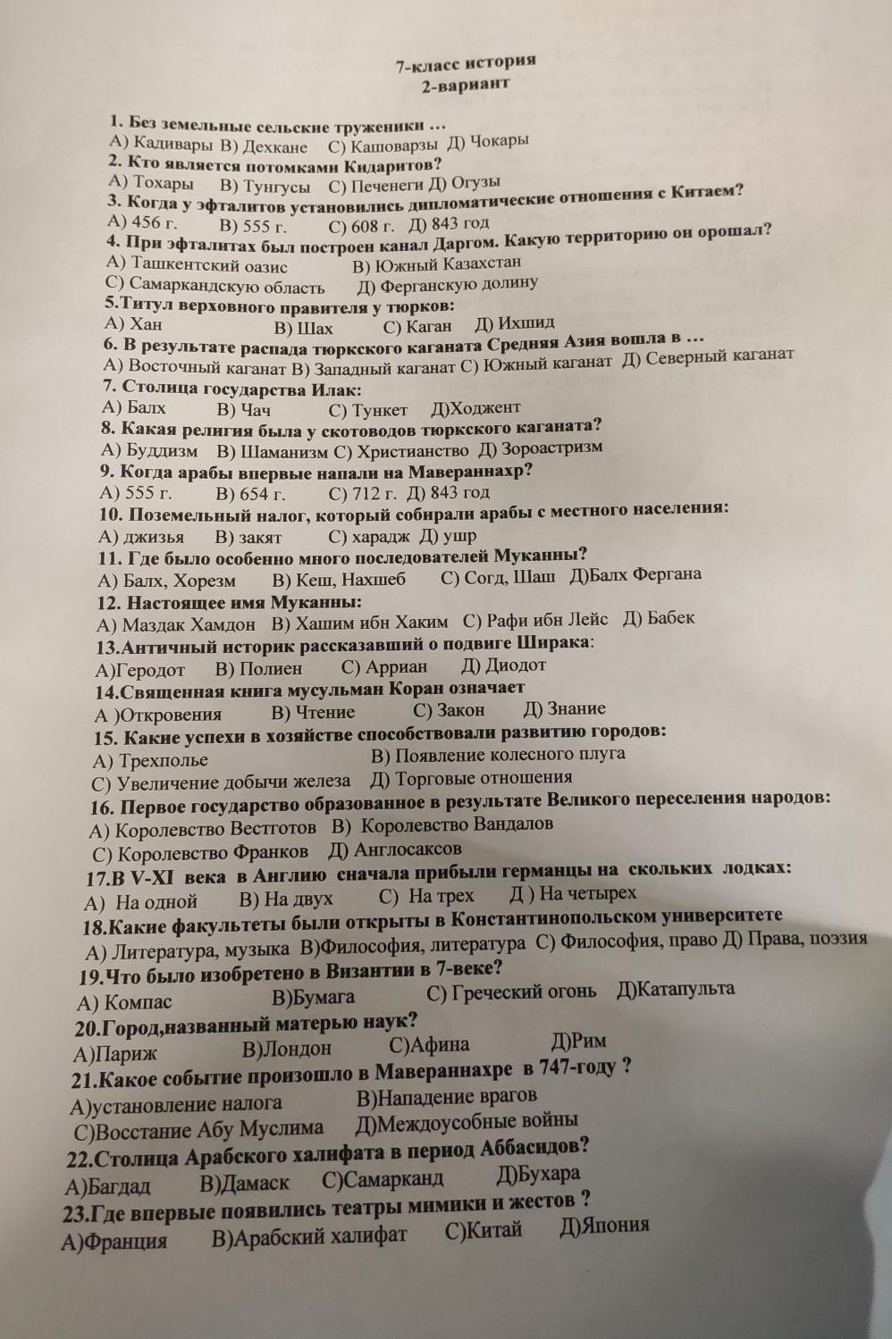1. Без земельные сельские труженики .. А) Кадивары В) Дехкане C) Кашоварзы Д) Чокары 2. Кто является потомками Кидаритов? A) Тохары В) Тунгусы C) Печенеги Д) Огузы 3. Когда у эфталитов установились дипломатические отношения с Китаем? А) 456 г. В) 555 г. C) 608 г. Д) 843 год 4. При эфталитах был построен канал Даргом. Какую территорию он орошал? А) Ташкентский оазис B) Южный Казахстан C) Самаркандскую область Д) Ферганскую долину 5.Титул верховного правителя у тюрков: А) Хан B) Шах C) Каган Д) Ихшид 6. В результате распада тюркского каганата Средняя Азия вошла в... A) Восточный каганат B) Западный каганат С) Южный каганат Д) Северный каганат 7. Столица государства Илак: A) Балх В) Чач C) Тункет Д)Ходжент 8. Какая религия была у скотоводов тюркского каганата? A) Буддизм В) Шаманизм С) Христианство Д) Зороастризм 9. Когда арабы впервые напали на Мавераннахр? А) 555 г. В) 654 г. C) 712 г. Д) 843 год 10. Поземельный налог, который собирали арабы с местного населения: А) ДЖизья В) закят С) харадж Д) ушp 11. Где было особенно много последователей Муканны? A) Балх, Хорезм B) Кеш, Нахшеб C) Согд, Шаш Д)Балх Фергана 12. Настоящее имя Муканны: А) Маздак Хамдон В) Хашим ибн Хаким С) Рафи ибн Лейс Д) Бабек 13.Античный историк рассказавший о подвиге Ширака: А)Геродот B) Полиен C) Арриан Д) Диодот