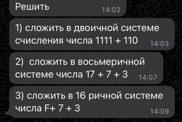 2) восьмеричная система (старшая цифра 7, 7 + 1 = 10)