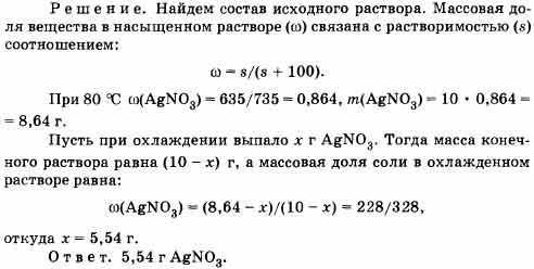 Определенная масса нитрата серебра выпадает в осадок из 20 г раствора, насыщенного при 80 градусах С при охлаждении его до 20 град.С? Растворимость AgNO3 составляет 635 г при 80 град.С и 228 г при 20град.С на 100 г воды: