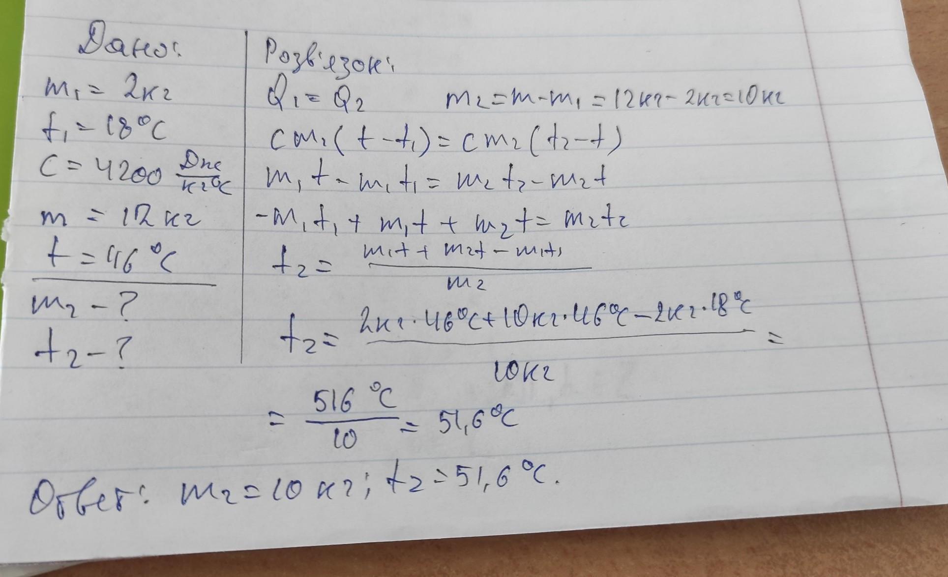 В первом сосуде было 2 килограмма воды при температуре 18 градусов. Во второй посудине находится неизвестная масса воды при неизвестной температуре. При смешивании этих двух жидкостей получили смесь массой 12 килограмм и температурой 46 градусов Цельсия. Установите массу воды и температуру воды во второй посудине.