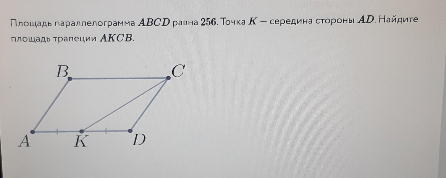 Площадь параллелограмма ABCD равна 256. Точка K— середина стороны AD. Найдите площадь трапеции АКСВ.