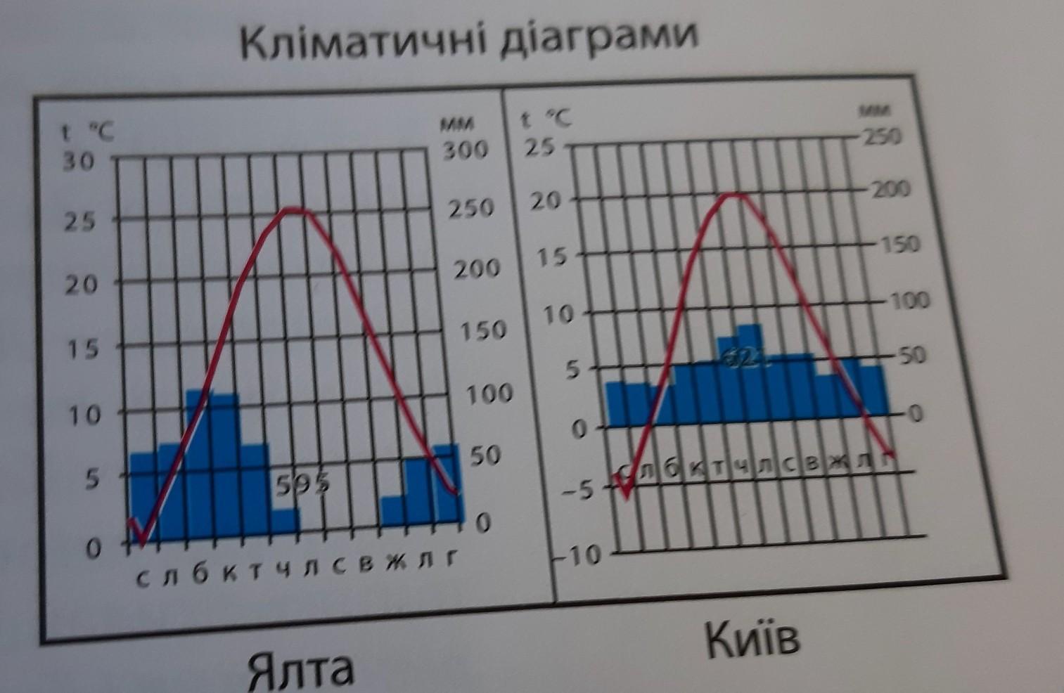 Ответ: Из диаграммы: Климат в Ялте - среднегодовая -влаги больше и температура выше, чем в Киеве.