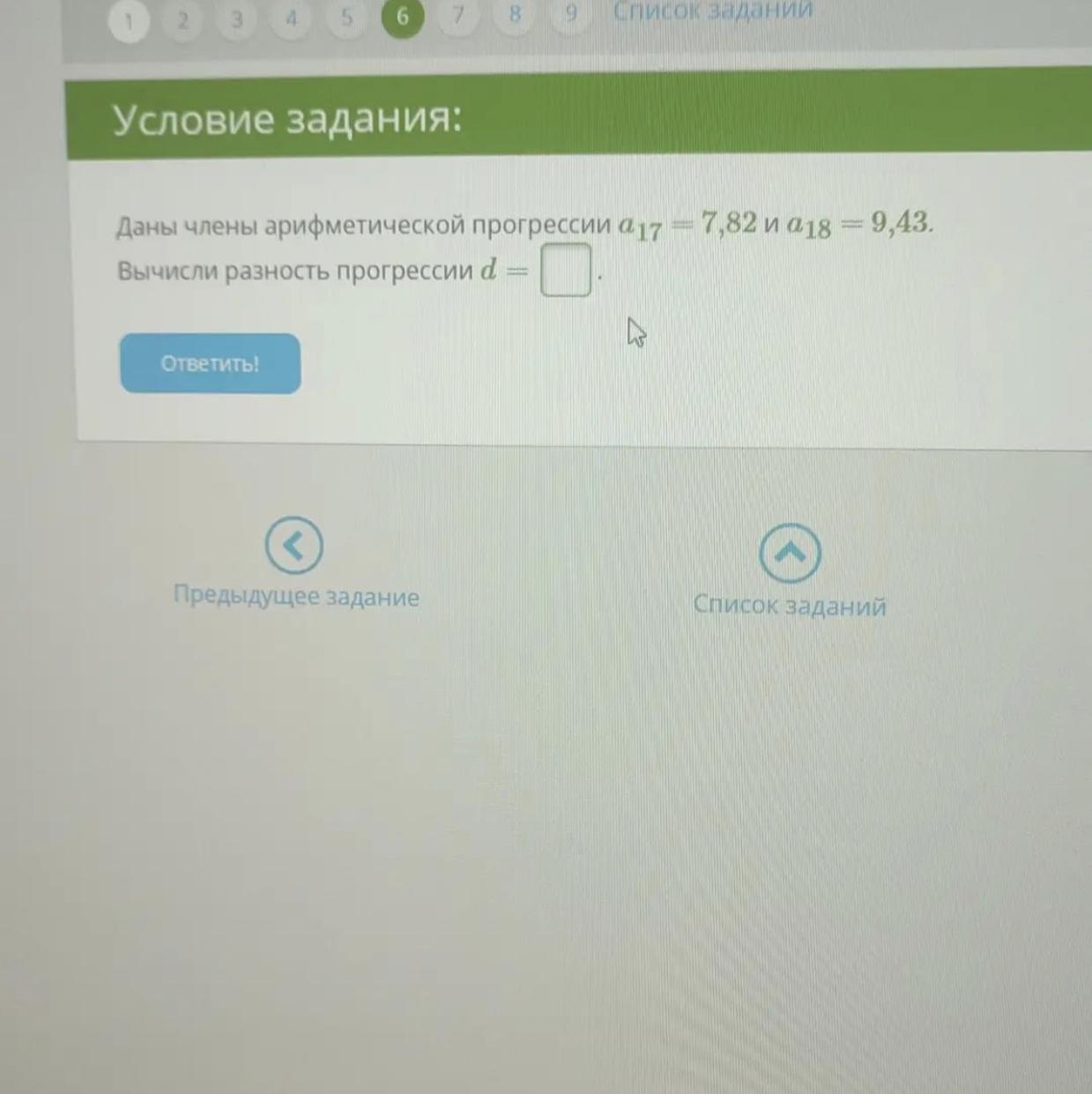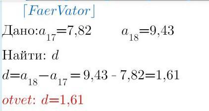 Даны члены арифметических прогерессии a17=7,82 и a18=9,43 вычислите разность прогрессии d