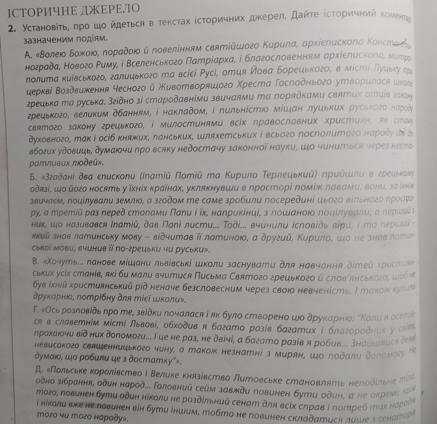 IC 6. заспокоєння руського ІСТОРИЧНЕ ДЖЕРЕЛО 2. Установіть, про що йдеться в текстах історичних джерел. Дайте історичний коментар зазначеним подіям. А. «Волею Божою, порадою й повелінням святійшого Кирила, архієпископа Константин нограда, Нового Риму, і Вселенського Патріарха, і благословенням архієпископа, митро- полита київського, галицького та всієї Русі, отця Йова Борецького, в місті Луцьку при церкві Воздвиження Чесного й Животворящого Хреста Господнього утворилася школа грецька та руська. Згідно зі стародавніми звичаями та порядками святих отців закону грецького, великим дбанням, і накладом, і пильністю міщан луцьких руського народу святого закону грецького, і милостинями всіх православних християн, як стану духовного, так і осіб КНЯЖих, панських, шляхетських і всього посполитого народу аж до вбогих удовиць, думаючи про всяку недостачу законної науки, що чиниться через неста ратливих людей». Б. Згадані два єпископи (Inаmій Потій та Кирило Терлецький) прийшли в грецькому одязі, що його носять у їхніх країнах, уклякнувши в просторі поміж лавами, вони, за їхнім звичаєм, поцілували землю, а згодом те саме зробили посередині цього вільного прос10- ру, а третій раз перед стопами Папи і іх, наприкінці, з пошаною поцілували; а перший з них, що називався Іпатій, дав Паnі листи... Тоді вчинили ісповідь віри, і то перший- який знав латинську мову – відчитав її латиною, а другий, Кирило, що не знав латин ської мови, вчинив її по-грецьки чи руськи», В. «Хочуть... панове міщани львівські школи заснувати для навчання дітей християн ських усіх станів, які би мали вчитися Письма Святого грецького й слов'янського, щоб не був їхній християнський рід неначе безсловесним через свою невченість. І також купили друкарню, потрібну для тієї школи», Г. «Ось розповідь про те, звідки почалася і як було створено цю друкарню: "Коли я оселі ся в славетнім місті Львові, обходив я багато разів багатих і благородних у со прохаючи від них допомоги. І це не раз, не двічі, а багато разів я робив... Знайшлися де невисокого священницького чину, а також незнатні з мирян, що подали допомогу. думаю, що робили це з достатку"». Д. «Польське королівство і Велике князівство Литовське становлять неподільне мі одно зібрання, один народ... Головний сейм завжди повинен бути один, а не окремії; Ари того, повинен бути один ніколи не роздільний сенат для всіх справ і потреб І ніколи вже не повинен він бути іншим, тобто не повинен складатися лише з сенаторів того чи того народу». Не mux народі T