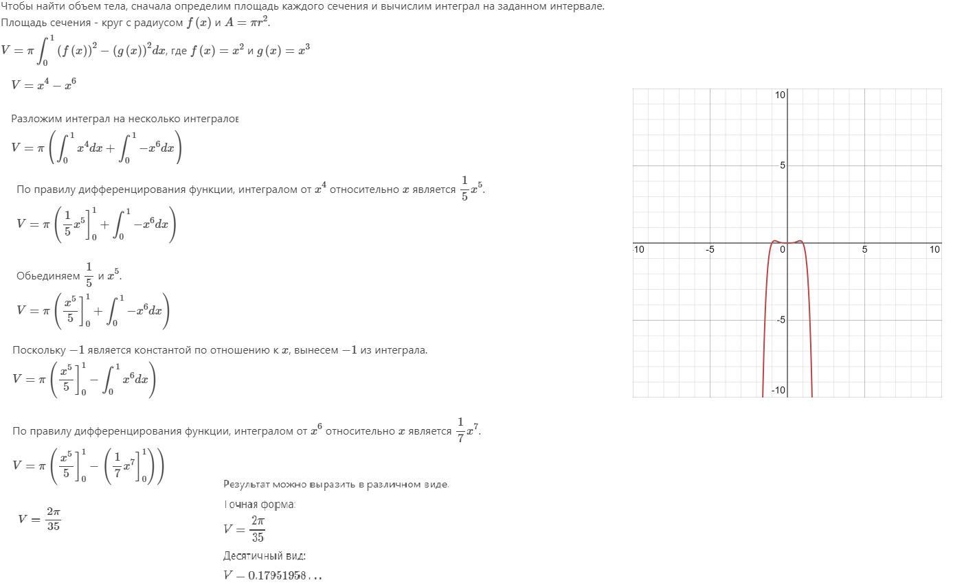 Найти объем тела, образованного оборачиванием вокруг оси Oy фигуры, ограниченной линиями: y=x^3, y=x^2.