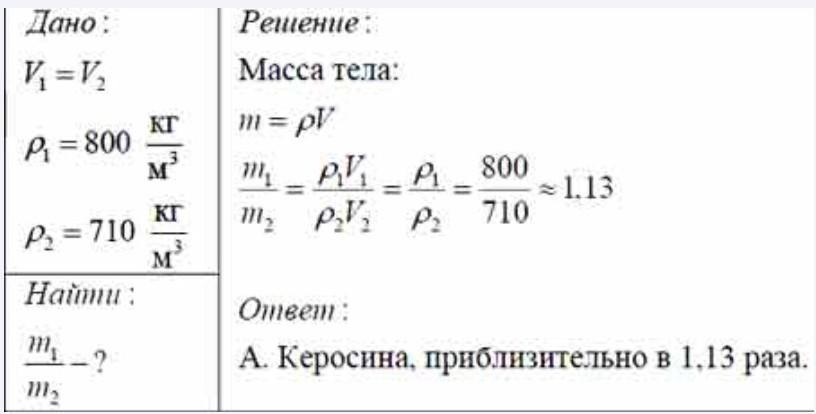 2. Две бочки наполнены горючим: одна бензином, другая керосином. Объём бочки с керосином в 3 раза больше объёма бочки с бензи- ном. Определите, во сколько раз отличаются массы бензина и керо- сина в бочках.