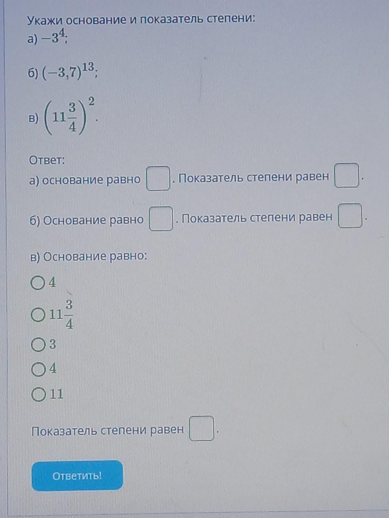 в. основание равно ( второй вариант ответа там где дробь) показатель степени равен 2