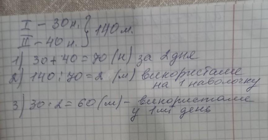 Первый день на фабрике сшили 30 одинаковых наволочек а во второй 40 таких же наволочек всего было использовано 140 м ткани Сколько метров ткани было использовано в первый день