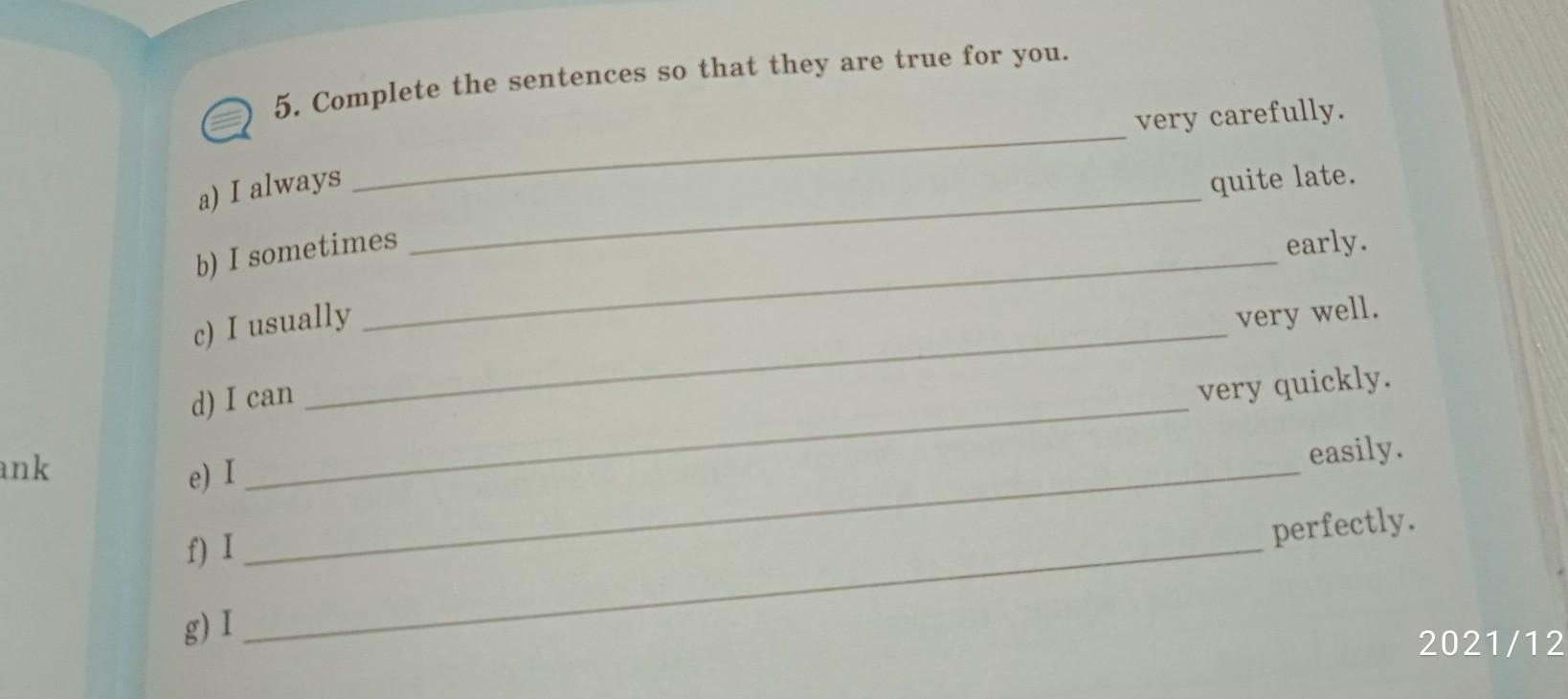 Это задание самостоятельное, здесь надо самому придумать предложения о своих делах в жизни, например I do maths very quickly в пункте e, переводится как "Я очень быстро решаю математику", поэтому я написал по рандому. Но не думаю что учителя будут об этом думать, главное правильно написать предложения.