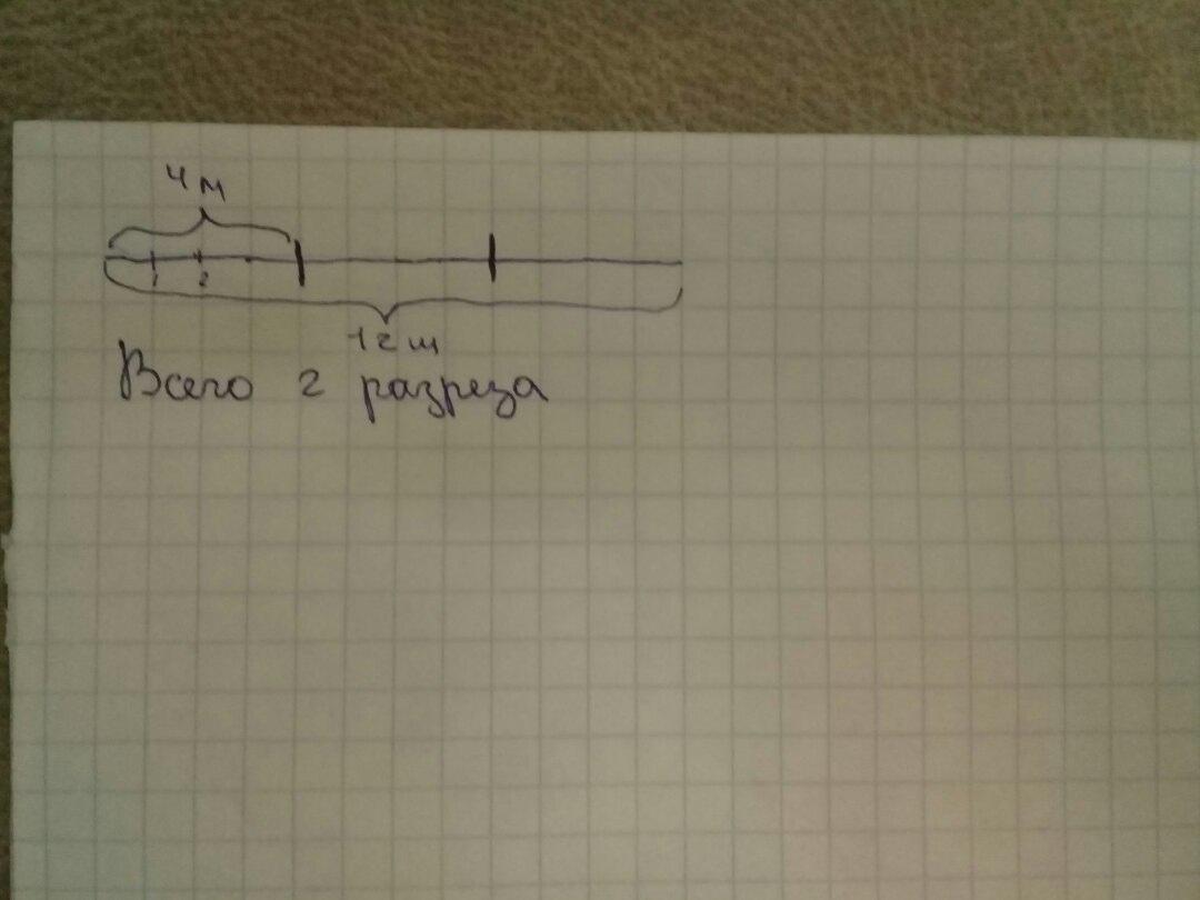 Шнур 12 метров разрезали на 3 равные по длине части . Сколько разрезов пришлось для этого сделать