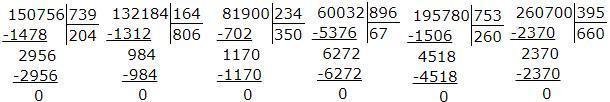 РАБОТА В ПАРЕ 4 Вычисли. 150 756: 739 132 184 : 164 81 900:234 60 032 : 896 195 780:753 260 700 : 395