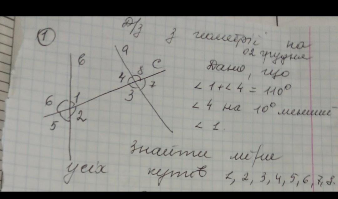 Пояснення:1–60,а 4–50.Кут 2 = 180-60=120.Кут 3=180-50=130.Кут 5 вертикальний до кута 1,а вертикальні кути рівні.Кут 6=180-60=120.Кут 7 вертикальний до кута 4,а вертикальні кути рівні.Кут 8=180-50=130.