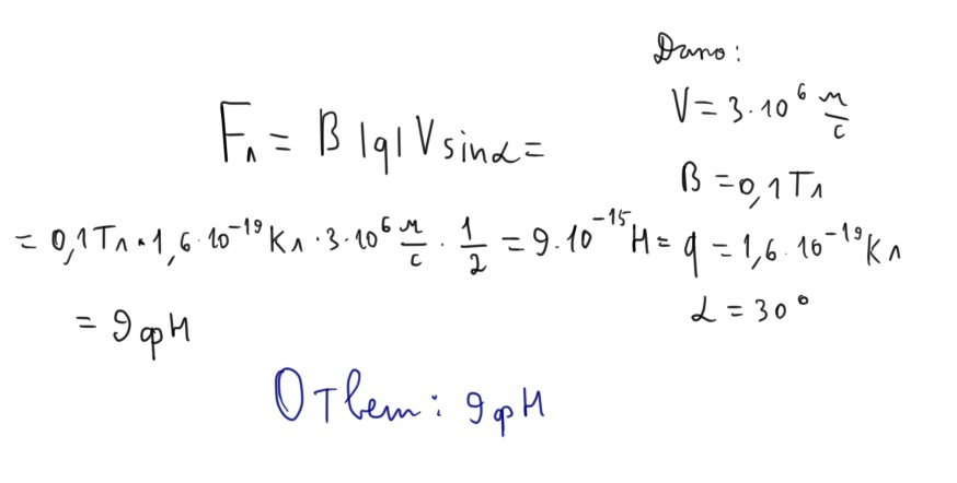 Протон движется со скоростью 3*10^6 м/с в однородном магнитном поле с индукцией 0.1 Тл. Заряд протона 1.6*10^-19 Кл. Чему равна сила, действующая на протон, если угол между направлением скорости протона и линиями индукции равен 30 градусов?