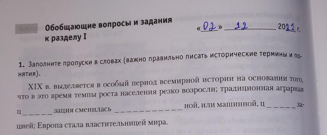 1. Заполните пропуски в словах (важно правильно писать исторические термины и по- нятия), XIX в. выделяется в особый период всемирной истории на основании того, что в это время темпы роста населения резко возросли; традиционная аграрная ІІ. залия сменилась Ной, или машинной, ц цией; Европа стала властительницей мира,