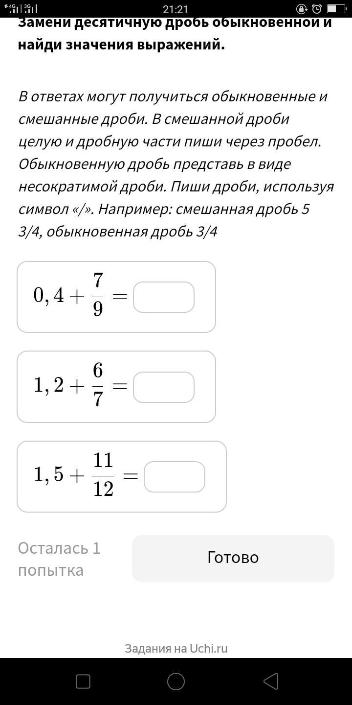 Так как семь девятых невозможно нацело перевести в десятичную дробь, мы ноль целых четыре десятых переводим в простую дробь: