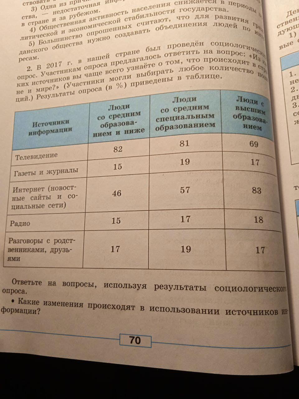 2. В 2017 году в нашей стране был проведен социологический опрос. Участникам опроса предлагалось ответить на вопрос: "Из каких источников вы чаще узнаете о том, что происходит в стране и мире?" (Участники могли выбирать любое кол-во позиций.) Результаты опроса (в %) приведены в таблице.