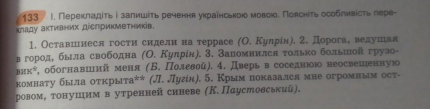 1. гості, що залишилися сиділи на терасі. 2. дорога, що веде до міста була вільна. 3. запам'яталась лише велика вантажівка, яка обігнала мене. 4. двері до сусідньої неосвіченої кімнати були відчинені. 5. Крим здався мені величезним островом, який тонув у ранковій синяві.
