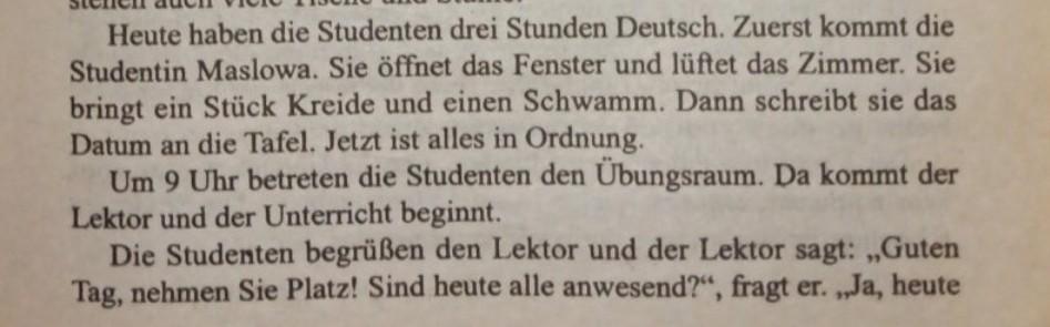 Сегодня у студентов три урока / часа немецкого языка. Сперва приходит студентка по фамилии Маслова. Она открывает окно и проветривает комнату. Она берёт кусок мела и губку. Потом пишет на доске дату. Теперь всё в порядке.