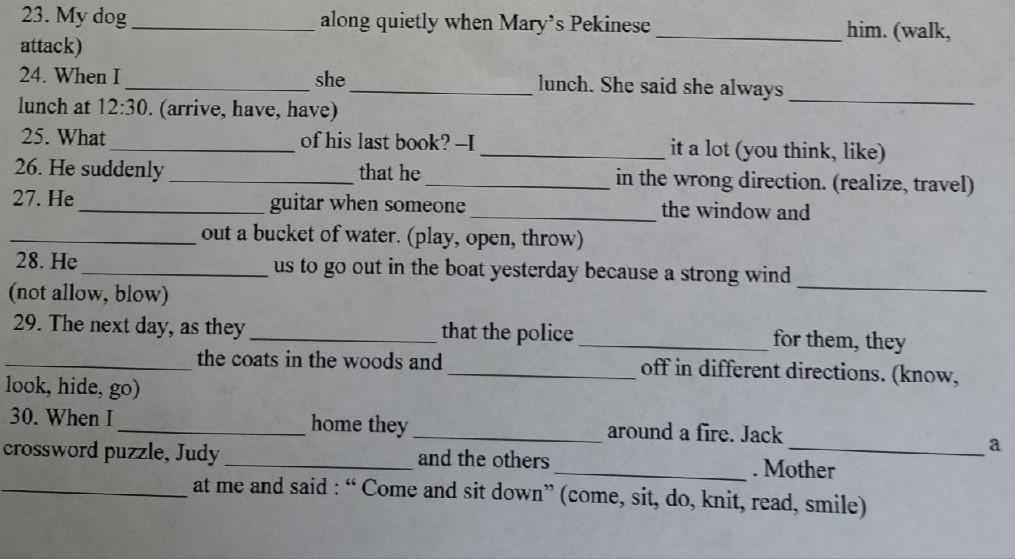 30 came-were sitting- was doing- was knitting- were reading-smiled