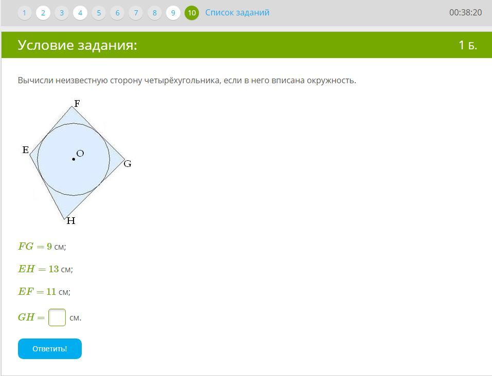 Вычисли неизвестную сторону четырёхугольника, если в него вписана окружность.