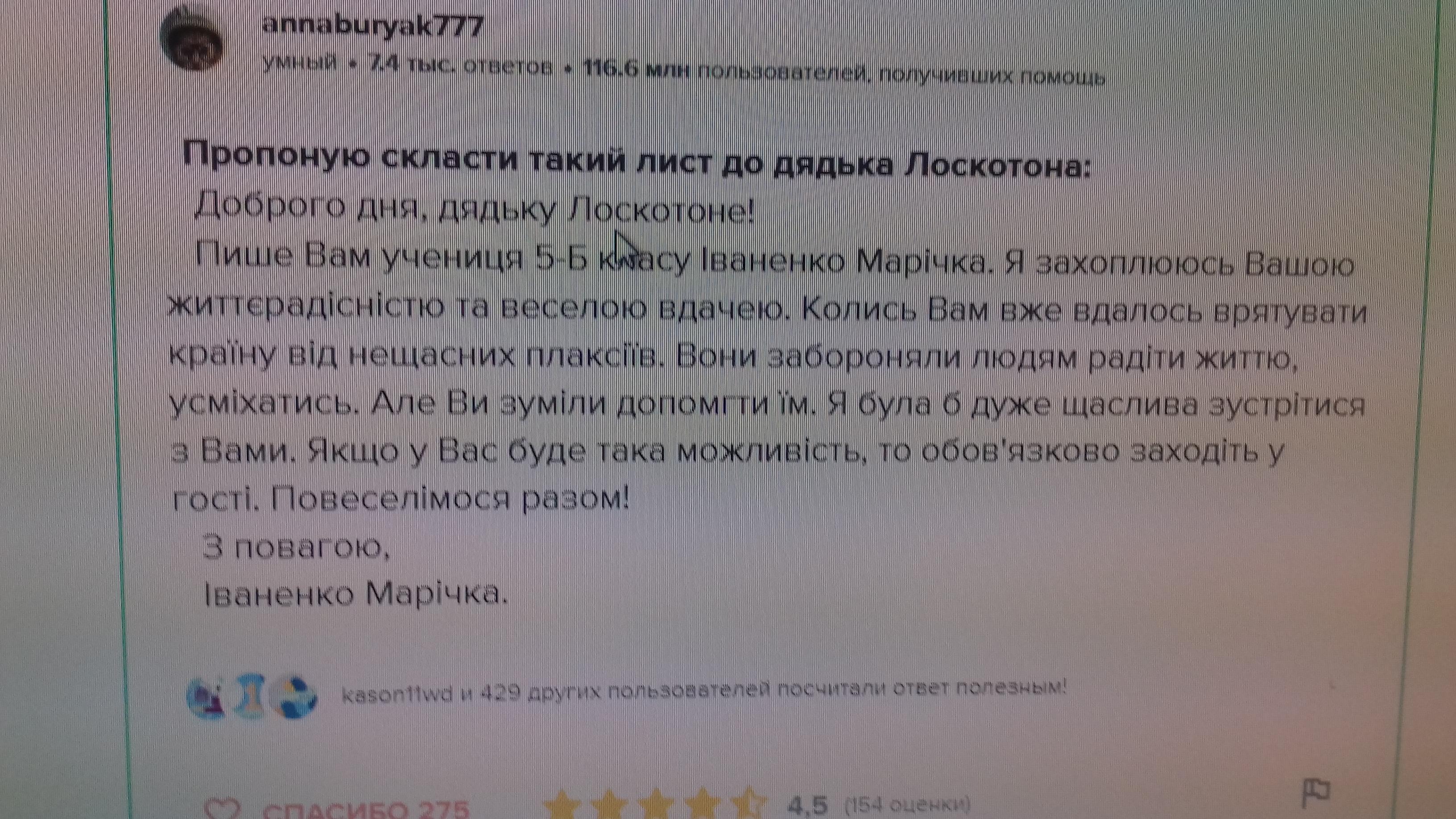 Напиши в хроме Скласти лист до дядька Лоскотона.