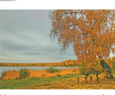 Ось і осінь прийшла. Розфарбувала листочки на деревах. Красиво навкруги, все вкрито ніби позолотою. Самотньо стоїть берізка біля річки, похилилася вперед, ніби хоче побачити, що там на тому березі. Небо потемніло, стало похмуро і прохолодно. Трохи сумно падають з дерева листочки. Скоро зима.