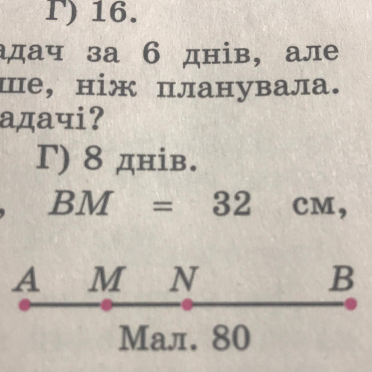 На малюнку 80 АВ = 40 см, ВМ = 32 см, АN = 19 см. Знайдіть довжину відрізка MN.