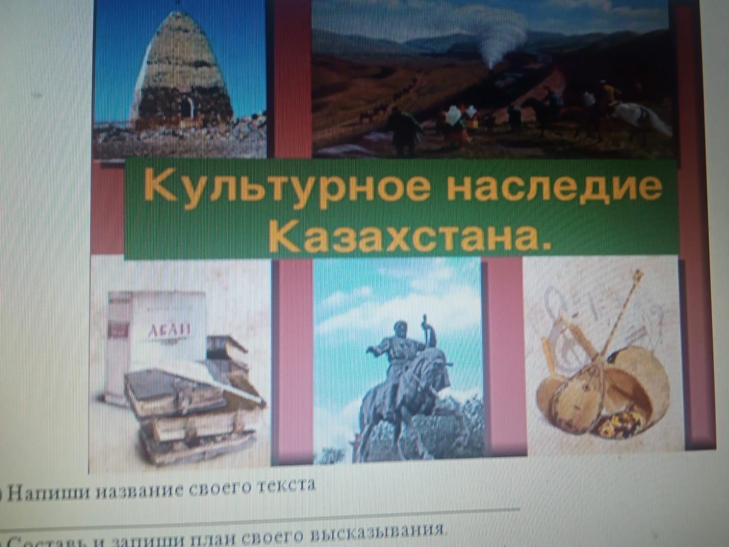 Задание 1. Подготови высказывание по данному коллажу. Культурное наследие Казахстана. Напиши название своего текста … запини план сво высказывания.