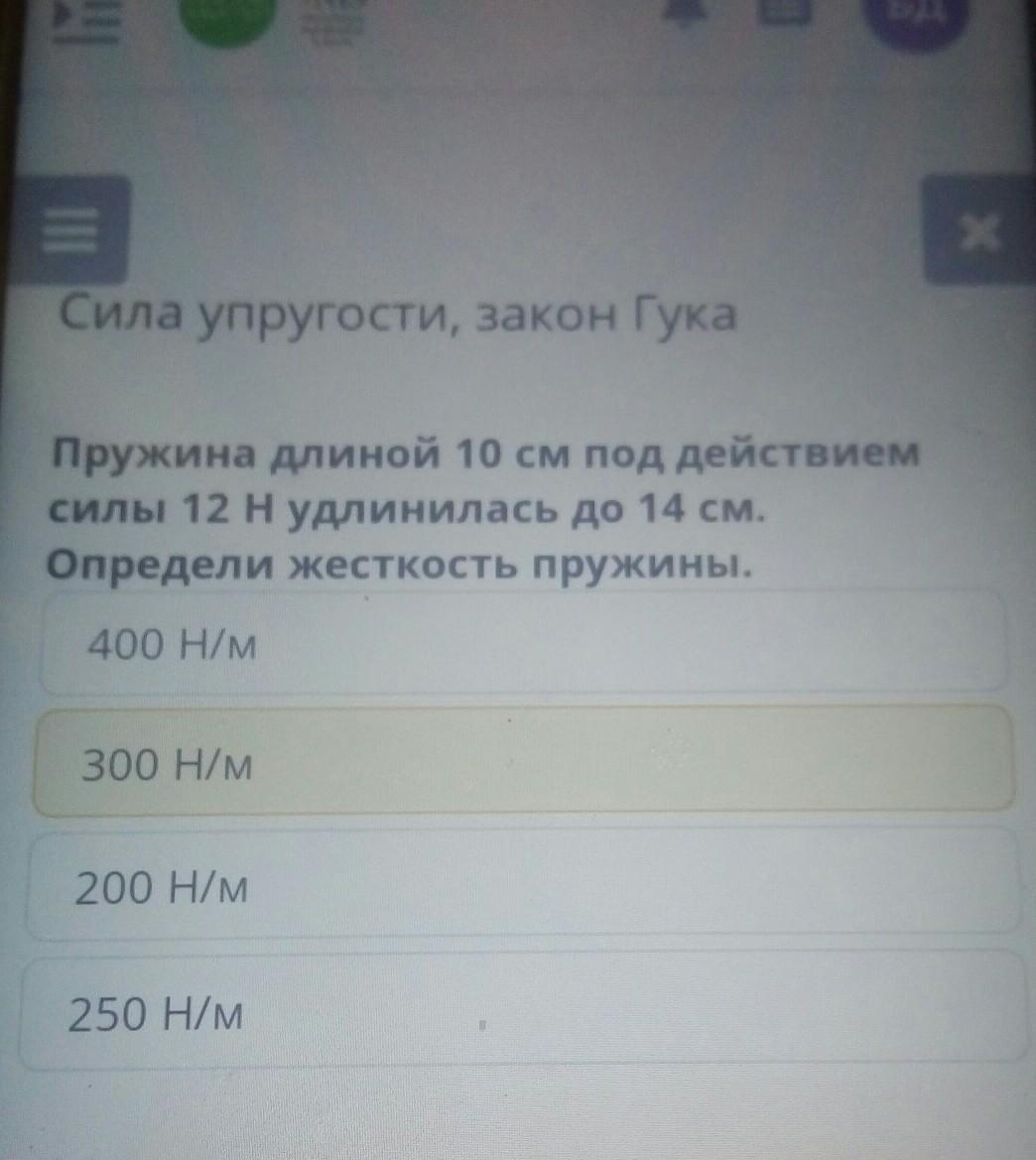 Сила упругости, закон Гука Пружина длиной 10 см под действием силы 12 н удлинилась до 14 см. Определи жесткость пружины. 400 Н/м 300 Н/м 200 Н/м 250 Н/м