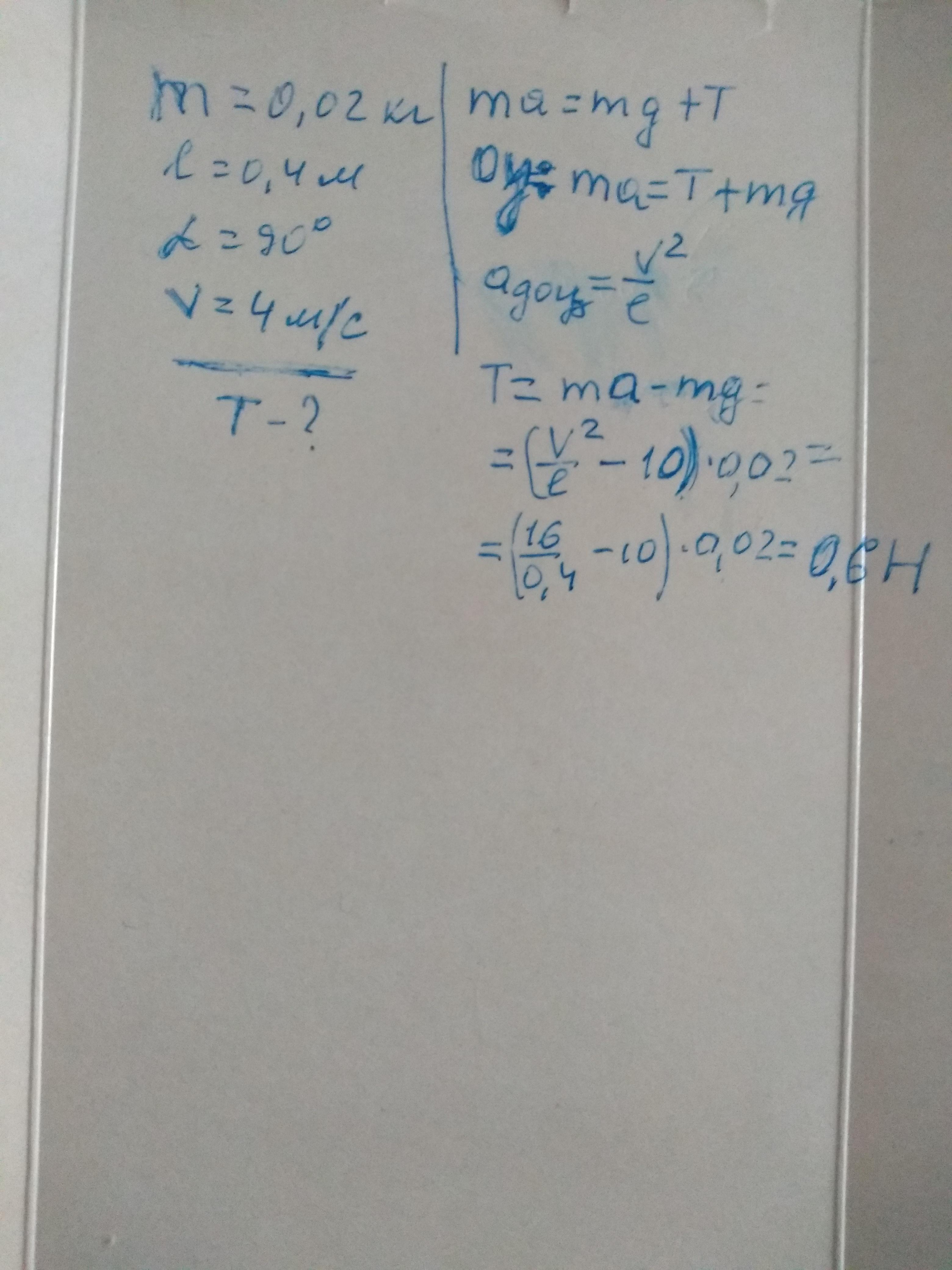 Вантаж що має масу 20 г і прикріплений до кінця невагомого стрижня завдовжки 40 см, рівномірно обертається у вертикальній площині з швидкістю 4 м/с. Яка сила натягу стрижня у момент, коли вантаж проходить верхню точку своєї траєкторії?