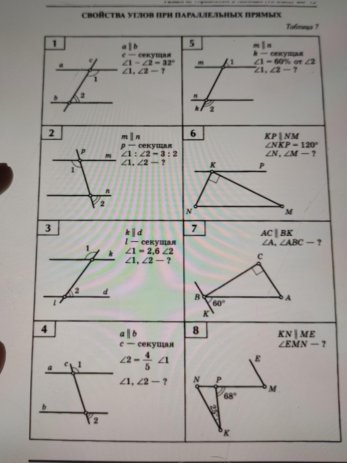 1. Пусть параллельные прямые a и b пересечены секущей MN (c). Докажем, что накрест лежащие углы 3 и 6 равны. Допустим, что углы 3 и 6 не равны. Отложим от луча MN угол PMN, равный углу 6, так, чтобы угол PMN и угол 6 были накрест лежащими углами при пересечении прямых МР и b секущей MN. По построению эти накрест лежащие углы равны, поэтому МР||b. Мы выяснили, что через точку М проходят две прямые (прямые a и МР), параллельные прямой b. Но это противоречит аксиоме параллельных прямых. Значит, наше допущение неверно и угол 3 равен углу 6
