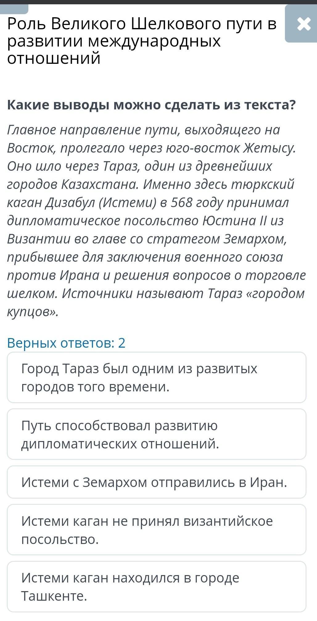Роль Великого Шелкового пути в развитии международных отношений Верных ответов: 2 Город Тараз был одним из развитых городов того времени. Путь способствовал развитию дипломатических отношений. Истеми с Земархом отправились в Иран. Истеми каган не принял византийское посольство. Истеми каган находился в городе Ташкенте.