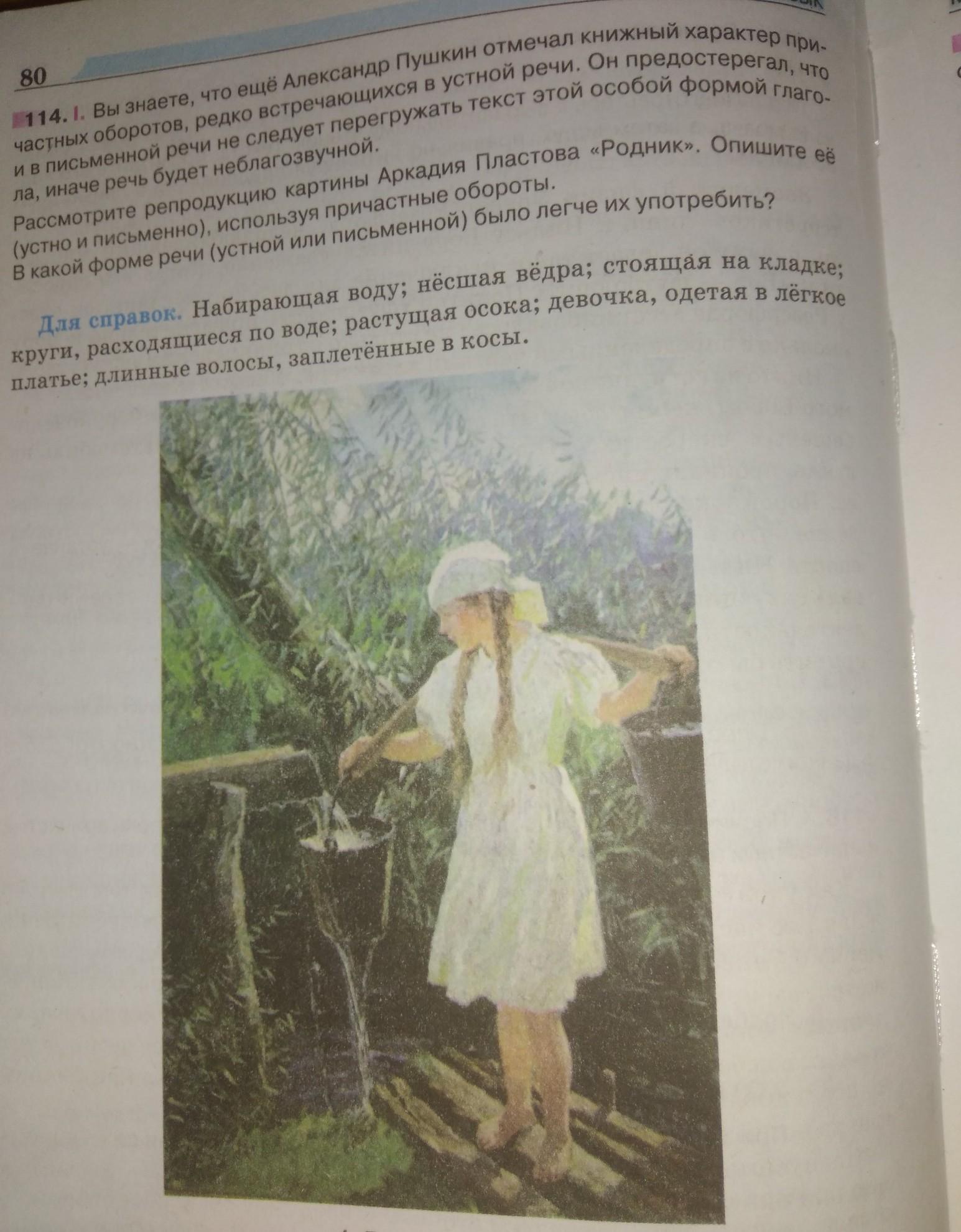 на переднем плане картины Аркадия Пластова «родник» изображена девочка, одетая в лёгкое белое платье. На голове у девочки косынка, из-под которой выглядывают длинные русые косы. Растущая осока на заднем плане имеет ярко-зеленую листву, что говорит как и платье девочки, что на улице стоит жаркое лето.