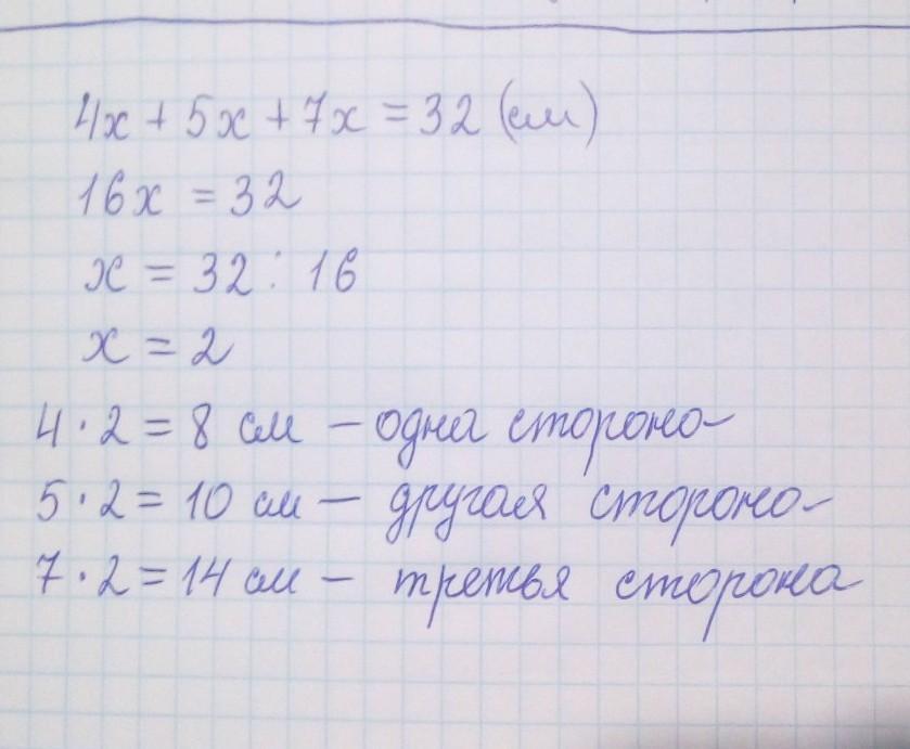 Сторони трикутника відносяться як 4:5:7. Периметр трикутника дорівнює дорівнює 32 см. Визначити довжини сторін трикутника від меншої до більшої