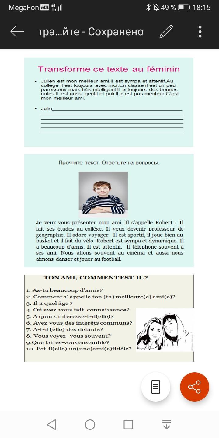 J'ai un ami. Il s'appelle André. Il a quatorze ans. Nous avons fait une connaissance à l'école. Il s'intéresse à la littérature et au sport. Nous avons des intérêts communs. Nous voyons les uns les autres chaque jour. On fait nos devoirs ensemble. C'est un ami fidèle.