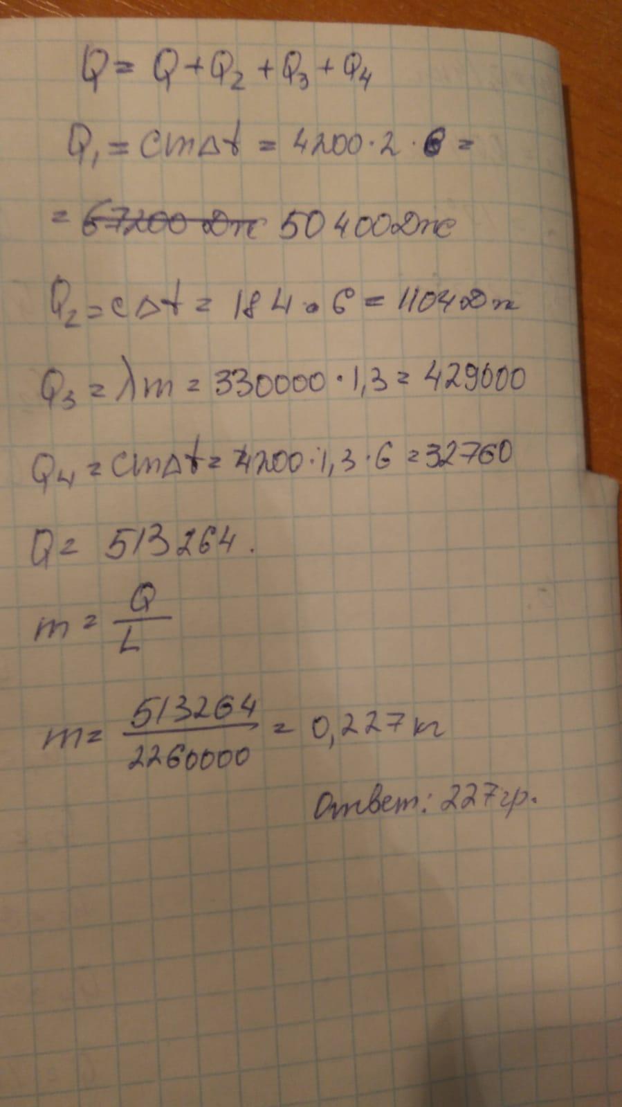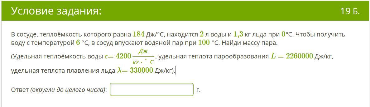 В сосуде, теплоёмкость которого равна 184 Дж/°С, находится 2 л воды и 1,3 кг льда при 0°С. Чтобы получить воду с температурой 6 °С, в сосуд впускают водяной пар при 100 °С. Найди массу пара.
