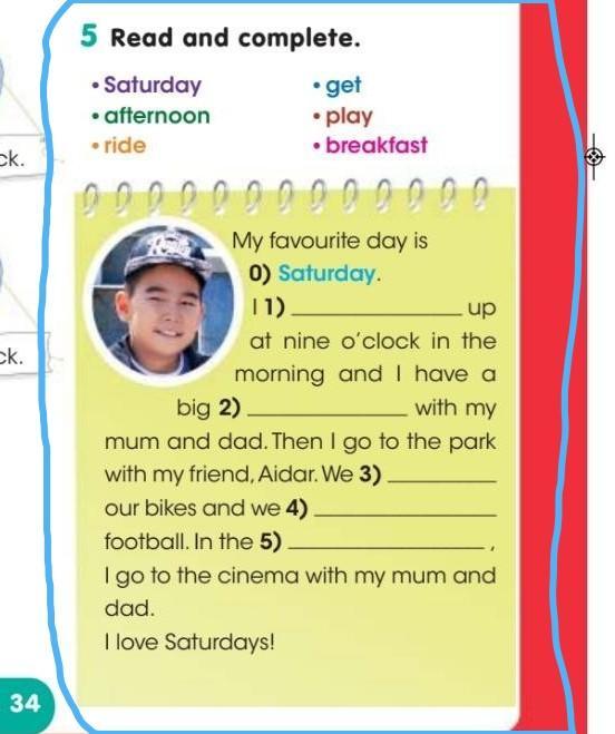 My favoutite day is Saturday. I get up at nine o'clock in the morning and I have a big breakfast with my mum and dad.Then I go to the park with my friend, Aidar.We ride our bijes and we play football. In the afternoon I go to the cinema with my mum and dad.