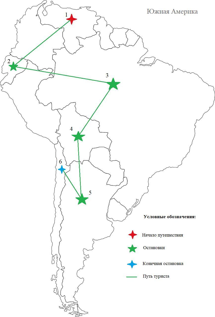 Турист совершил путешествие по Южной Америке. Определите, в какой стране он начал свой путь и в какой завершил, в каких странах сделал остановки. Укажите названия этих стран. Используя карты (политическую и физическую), определите, какие крупные географические объекты расположены на территории этих стран. Приведите 2-3 примера.