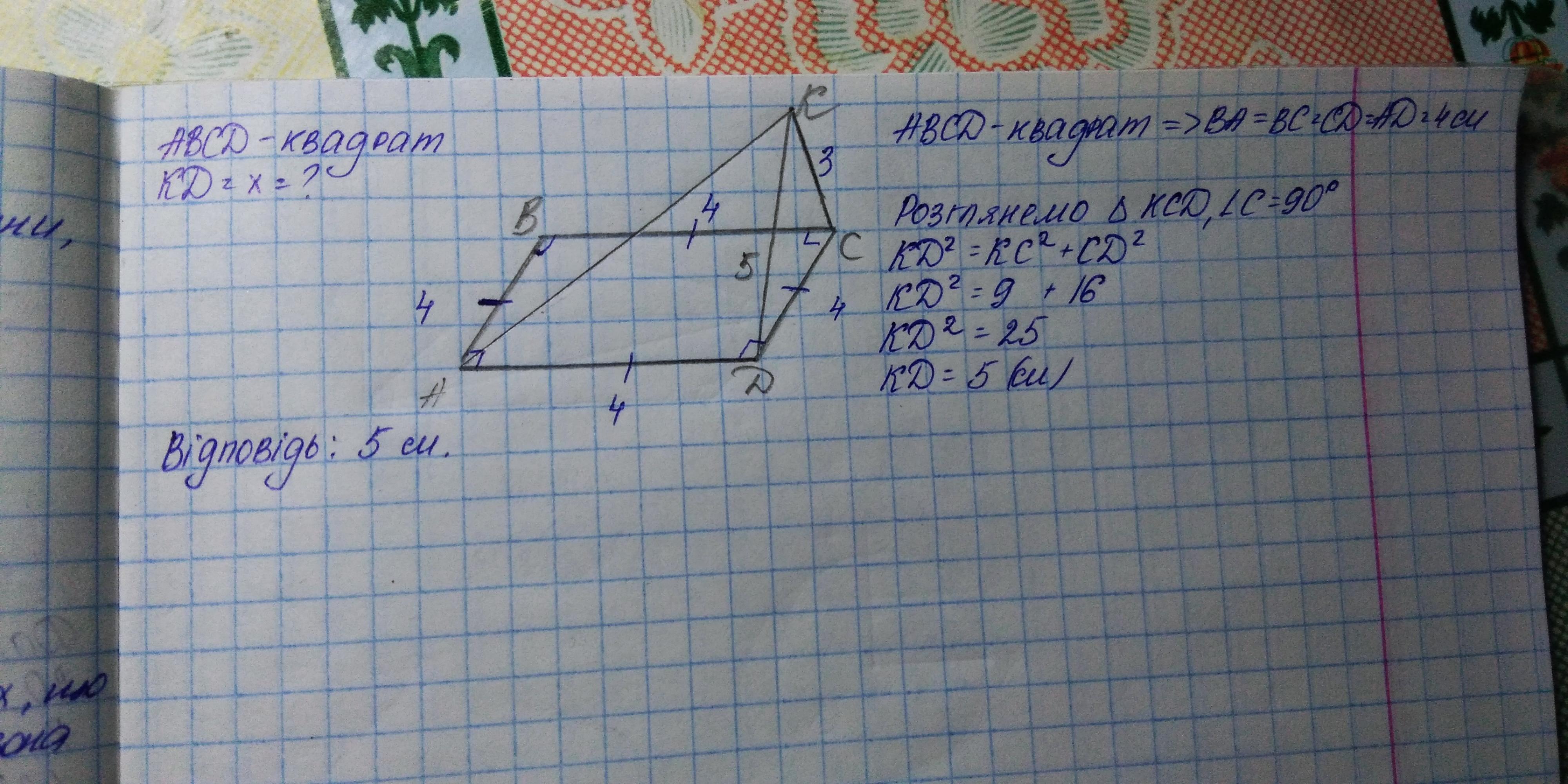 Abcd квадрат,kc перпендикуляр до площини квадрата зі стороною 4 см,kc =3см.