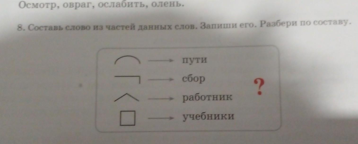 8. Составь слово из частей данных слов. Запиши его. Разбери по составу. пути ? сбор работник учебники