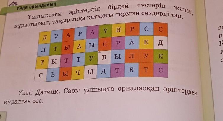 Үйде орындайық Ұяшықтағы әріптердің бірдей түстерін жинап, , құрастырып, тақырыпқа қатысты термин сөздерді тап. ду у А A PAYир с С JI ТЫ AЫ С РАК Д T ЫТТ У БЫЛ УК Т С Б T С Б ЫЧЫ Д Үлгі: Датчик. Сары ұяшықта орналасқан әріптерден кұралған сөз.