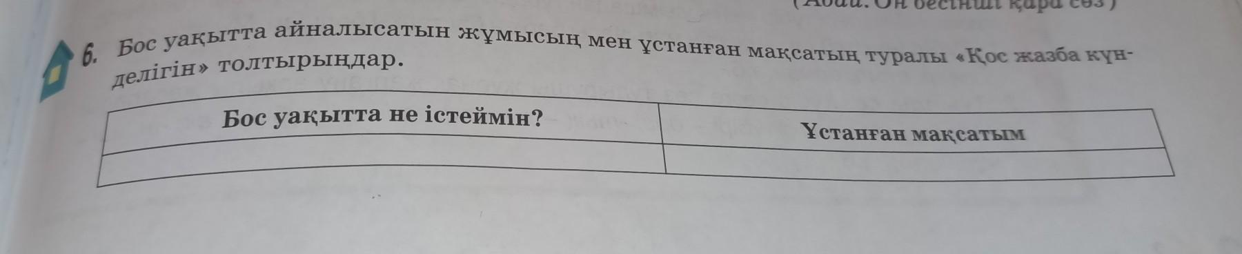 6. Бос уақытта айналысатын жұмысың мен ұстанған мақсатың туралы «Қос жазба күн- делігін» толтырыңдар. Бос уақытта не істеймін? ұстанған мақсатым