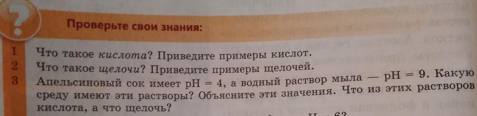 Апельсиновый сок - это кислота, раствор мыла - щёлочь.