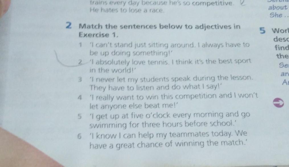 5 2 Match the sentences below to adjectives in Exercise 1. 1 "I can't stand just sitting around. I always have to be up doing something!" 2 l absolutely love tennis. I think it's the best sport in the world! 3 "I never let my students speak during the lesson. They have to listen and do what I say!" 4 "I really want to win this competition and I won't let anyone else beat me!" 5 'l get up at five o'clock every morning and go swimming for three hours before school. 6 'I know I can help my teammates today. We have a great chance of winning the match.