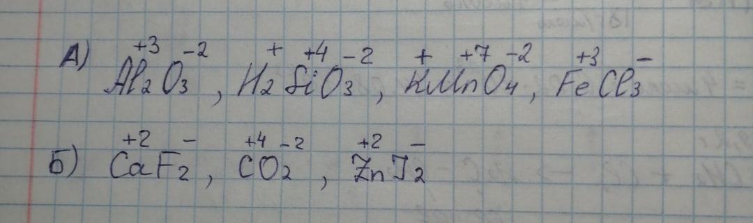 a)определите степень окисления в следующих веществах: Al2O3 H2SiO3 KMnO4 FeCl3
