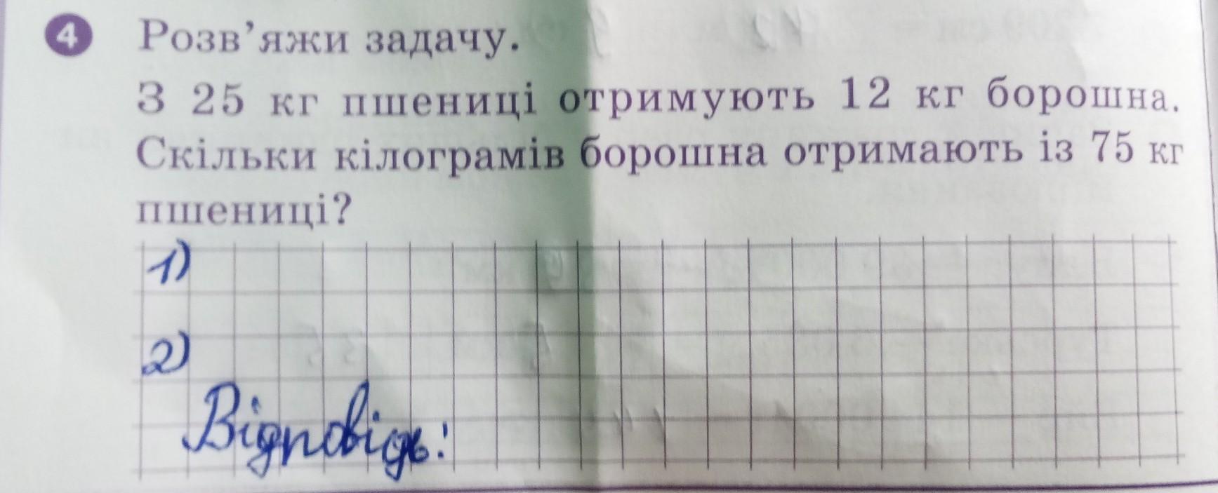 З 25 кг пшениці отримують 12 кг борошна. Скільки кілограмів борошна отримають із 75 кг пшениці?